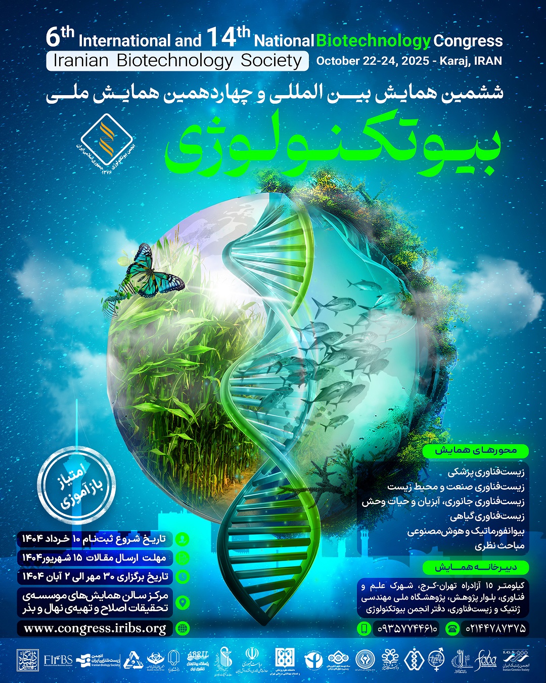 ششمین همایش بینالمللی و چهاردهمین همایش ملی بیوتکنولوژی ایران از سی ام مهرماه تا دوم آبان ماه ۱۴۰۴ در مرکز همایشهای مؤسسه تحقیقات اصلاح و تهیه نهال و بذر (کرج) برگزار میشود.