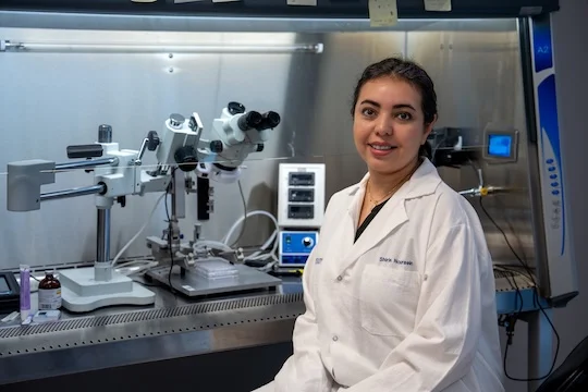 نورآیین، دانش آموخته کارشناسی علوم و مهندسی دانشگاه علم و صنعت، کارشناسی ارشد مهندسی زیست پزشکی (مهندسی بافت) دانشگاه تهران و دکتری این رشته در دانشگاه رایس است.
